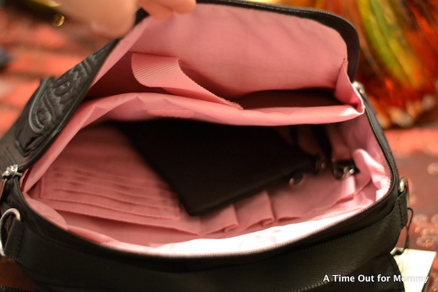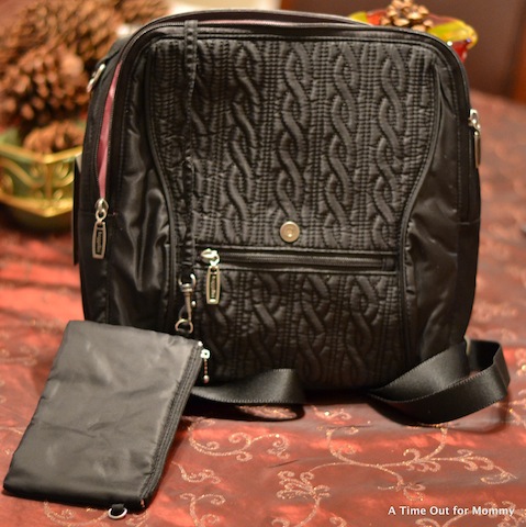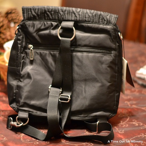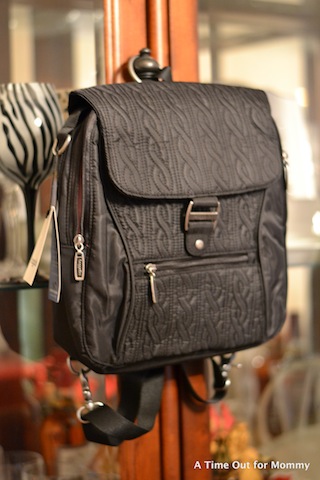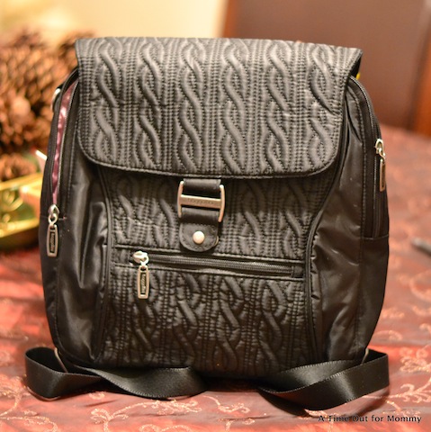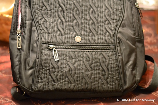 Baggallini is a company that keeps YOU in mind. They started in 1955 with the idea that women want to stay stylish while also being organized. The Enchant by Baggallini is a nylon back-pack style bag that features many compartments, even a padded area for a tablet! Since I still have to carry diapers and wipes everywhere I go, this compartment is currently used for toting them. I love that the bag has many mini-compartments where I can keep my keys, hand sanitizer, and cell phone for easy access. These are the things that often get lost in the abyss of a large diaper bag. If you’ve had bags that don’t completely close on top, then you may have experienced the “overflow” or the dreaded bag falling over and having your belongings spill out. I love that this bag not only has a zipper to close it on top, but it also has a flap on top that covers the zipper. So you have double protection from things falling out of your bag.