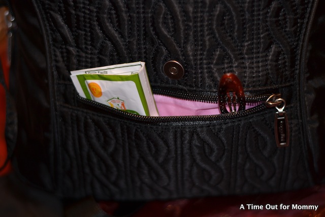 In my Enchant by Baggallini Bag: wallet, boogie wipes, my “active” camera, diapers, wipes, diaper cream, pacifier case, change of baby clothes, and a receiving blanket.