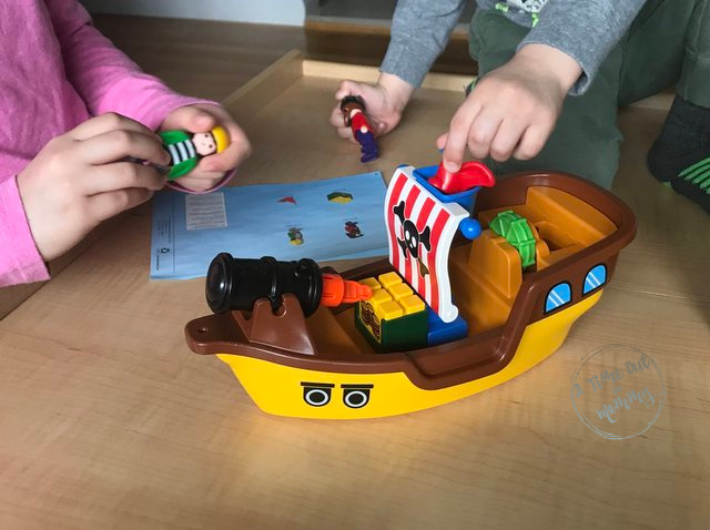 This set is a just-right sized ship for my little guy. His older sisters helped put it together and they were ready to set sail in no time! The ship has a rotating wheel to steer, and a REAL water cannon that can be filled up to squirt at fellow scallywags. The vibrant colors are attractive, and the larger, easy to hold pieces are great for chunky little hands. The ship even floats, which would be fun in the summer on their water tables.