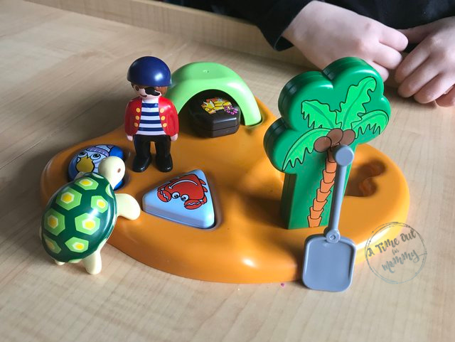 This set is a great addition to the 1.2.3 Pirate Ship. The ship can set sail to or from the Pirate Island which has a fun matching game built in! Little hands can learn to match shapes by placing the sea creatures in their slots. Pirate treasure is waiting to be discovered and a pirate is there to join the fun.